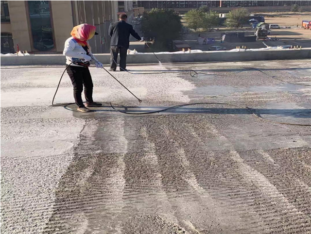 ③喷涂首遍SBS高聚物改性乳化沥青防水涂料,等表干后再喷涂第二、三遍防水涂料,直到达到理想的厚度。(一般涂膜厚度为0.4mm~0.7mm,其用量为1.6kg/㎡)。